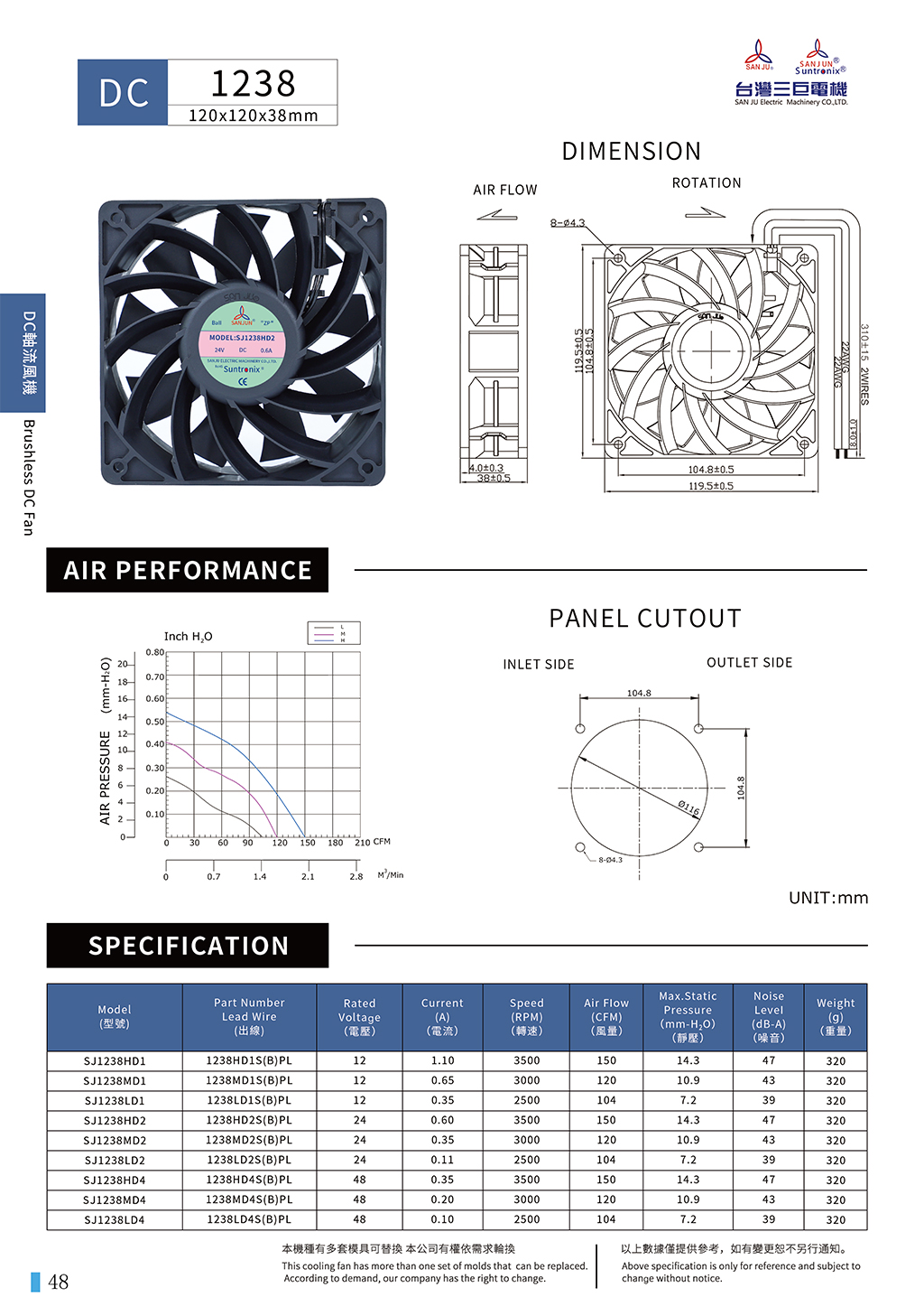 尺寸:120x120x38mm 框架: UL94V-0 軸承: 含油軸承& 雙滾珠軸承 電壓:DC 5V 12V 24V 48V 壽命:50 000Hours at 25℃--滾珠軸承 30 000Hours at 25℃--含油軸承 工作溫度:-20℃~70℃ 正常濕度 儲存溫度:-20℃~85℃ 正常濕度