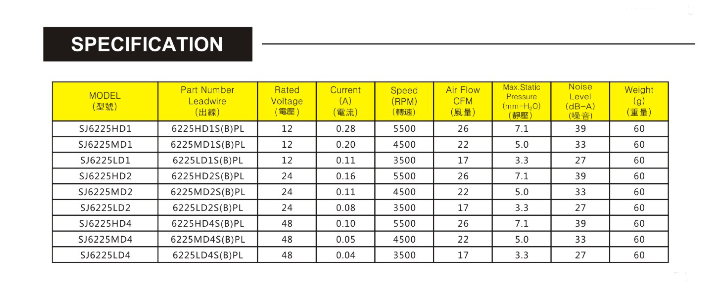 尺寸:60x60x25mm 框架: UL94V-0 PBT 軸承: 含油軸承& 雙滾珠軸承 電壓:DC 5V 12V 24V 48V 壽命:50 000Hours at 25℃--滾珠軸承 30 000Hours at 25℃--含油軸承 工作溫度:-20℃~70℃ 正常濕度 儲存溫度:-20℃~85℃ 正常濕度